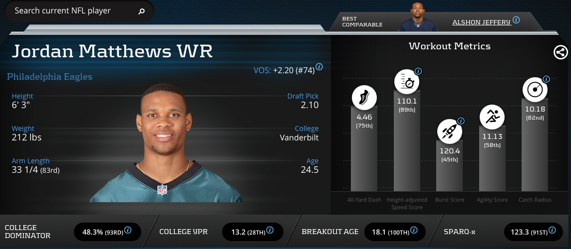 Jordan Matthews is a highly talented receiver who posted a 110.1 Height-Adjusted Speed Score (HaSS) (89th-percentile) and 123.3 SPARQ-x Score (91st percentile), but spent his third year in a situation where his team was breaking in a rookie quarterback, and the numbers showed. After a hot start that included 15 catches for 204 yards and 2 touchdowns over his first three games, Matthews looked primed for a third-year breakout. However, nagging injuries, the rookie struggles of Carson Wentz, and Doug Pederson’s conservative play calling severely dented Matthews’ production, most evidenced by his 7.2 yards per target (100th) and 561 air yards per target (27th).