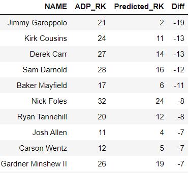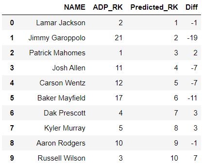 Applying the model to 2020, we predict where a QB will rank in Fantasy Points per Game using current ADP. That can then be used to mine QB values in drafts when compared to current ADP. To start with, here is the top ten in predicted Fantasy Points per Game.