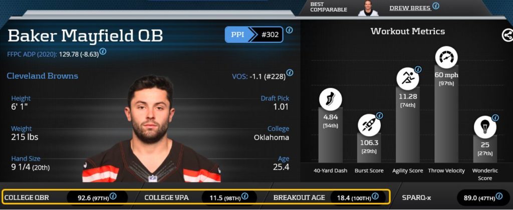 Mayfield has not had the strongest start to his career, but do not lose sight of the fact that this was one of the best QB prospects of all time. He put up a 92.6 (97th-percentile) College QBR with an 11.5 (98th-percentile) Yards per Attempt mark and an 18.4 (100th-percentile) Breakout Age. The pieces haven’t come together yet in Cleveland, but this may be the year they do given the weapons at Mayfield’s disposal. This looks like a situation for a top 10 QB.