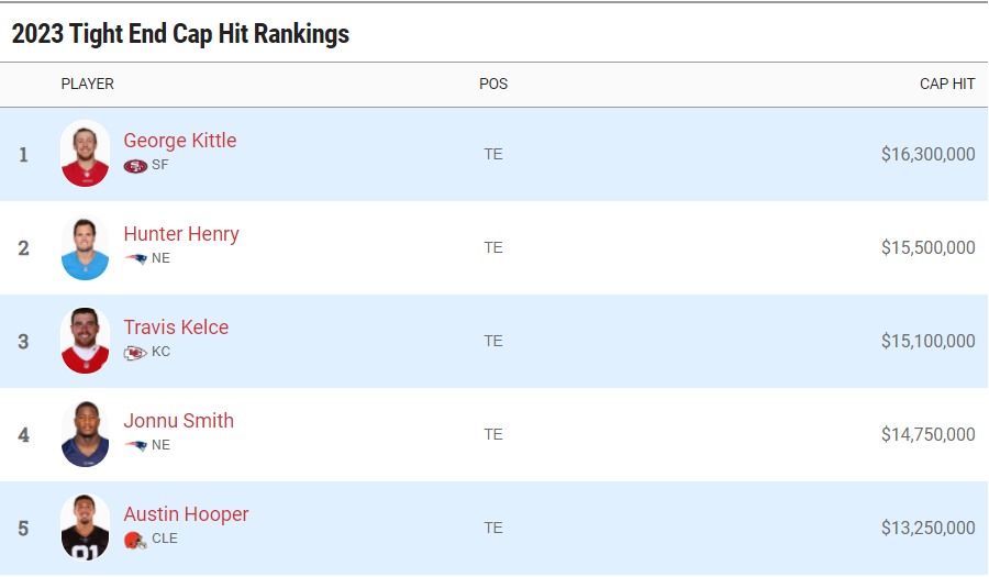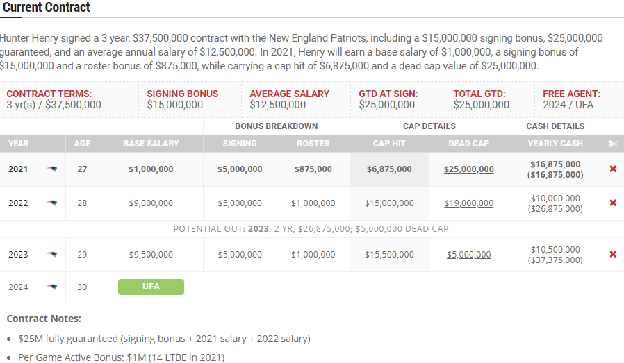 Despite signing a contract with one less season than Smith, Hunter Henry‘s average annual salary of $12.5 million matches Smith’s average annual salary. Another similarity in Henry’s contract is that his 2021 and 2022 salaries are fully guaranteed. During the entirety of his three-year contract length, he will have a higher cap hit on the team’s yearly salary caps than Smith. The Patriots can move on from Henry after the 2022 season before his cap hit increases to $15.5 million in 2023. Smith’s 2023 cap hit will be $14.75 million.