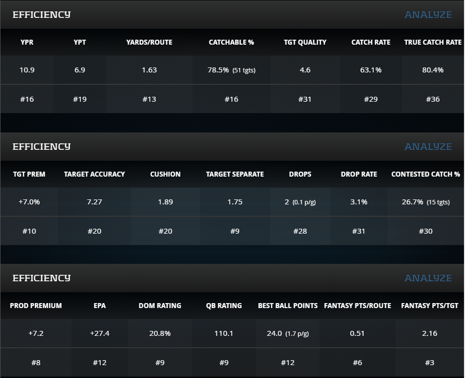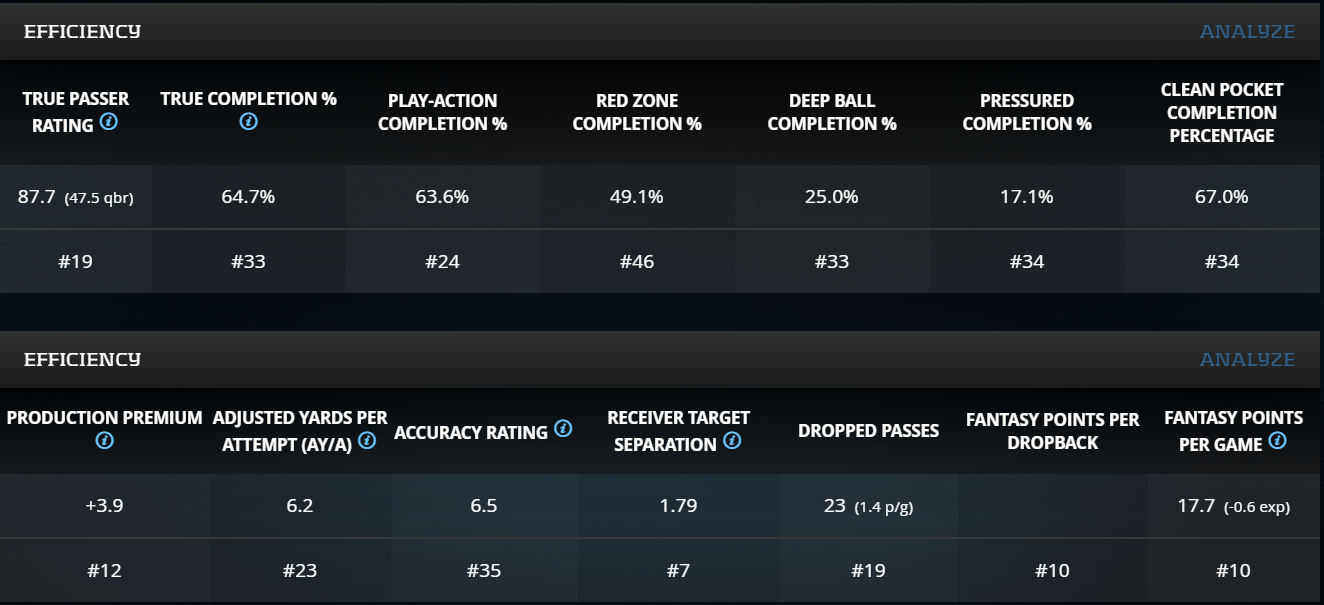 A mistake that people make in trading is that they acquire players on past performances instead of future projections. As a passer, Newton was putrid last season with a 71.2-percent (No. 28) True Completion Percentage and a 73.9-percent (No. 35) Catchable Pass Rate contributing to his -11.3 (No. 28) Production Premium. Thank goodness his Supporting Cast Efficiency will be better in 2021 than the -3.97 (No. 22) mark it received in 2020.