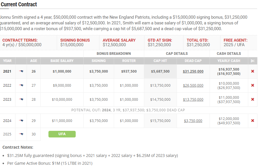 Smith’s four-year, $50 million contract sees his 2021 and 2022 salaries fully guaranteed, and the Patriots won’t receive significant financial relief from moving on from him until after the 2023 season, where they can save $12 million on the 2024 salary cap.