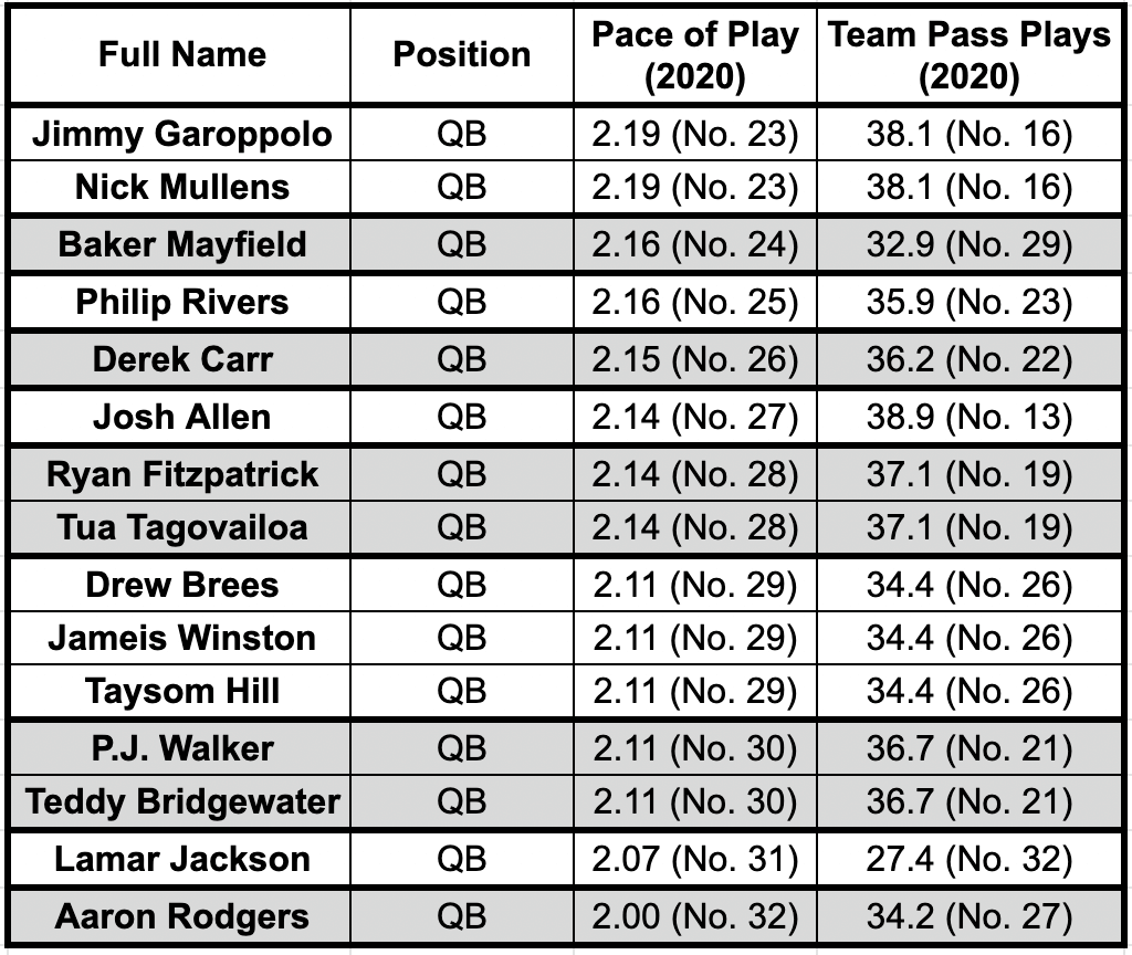 When glancing at the leaders in 2020, we notice several quarterbacks ranking highly in Team Pass Plays Per Game. At least outside of Ryan Tannehill, who fell into the group of high-efficiency outliers at quarterback. That said, let’s dive into some outliers in Pace of Play to help paint the picture of its value in fantasy football analysis.