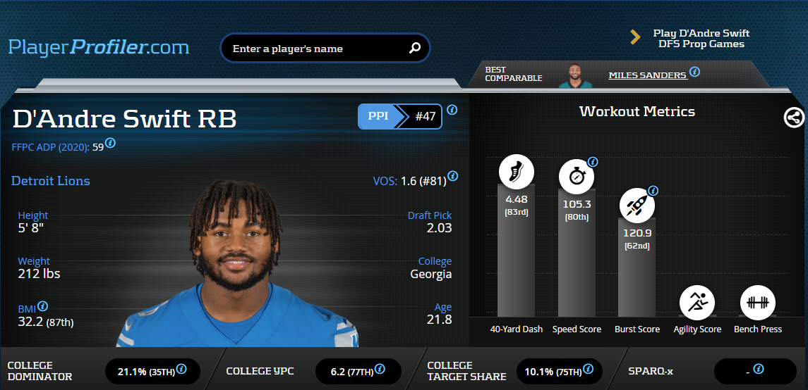 D’Andre Swift was the latest rookie breakout in a season chock-full of early returns on rookie investments. Swift got more than double his season total in carries (14), responding with 116 yards and two short scores. Adrian Peterson still got 15 carries, of course, and turned them into 40 yards and a score. That’s Patricia-ball for you, and Swift will have to garner more volume to give us confidence in him as an RB2 play going forward.