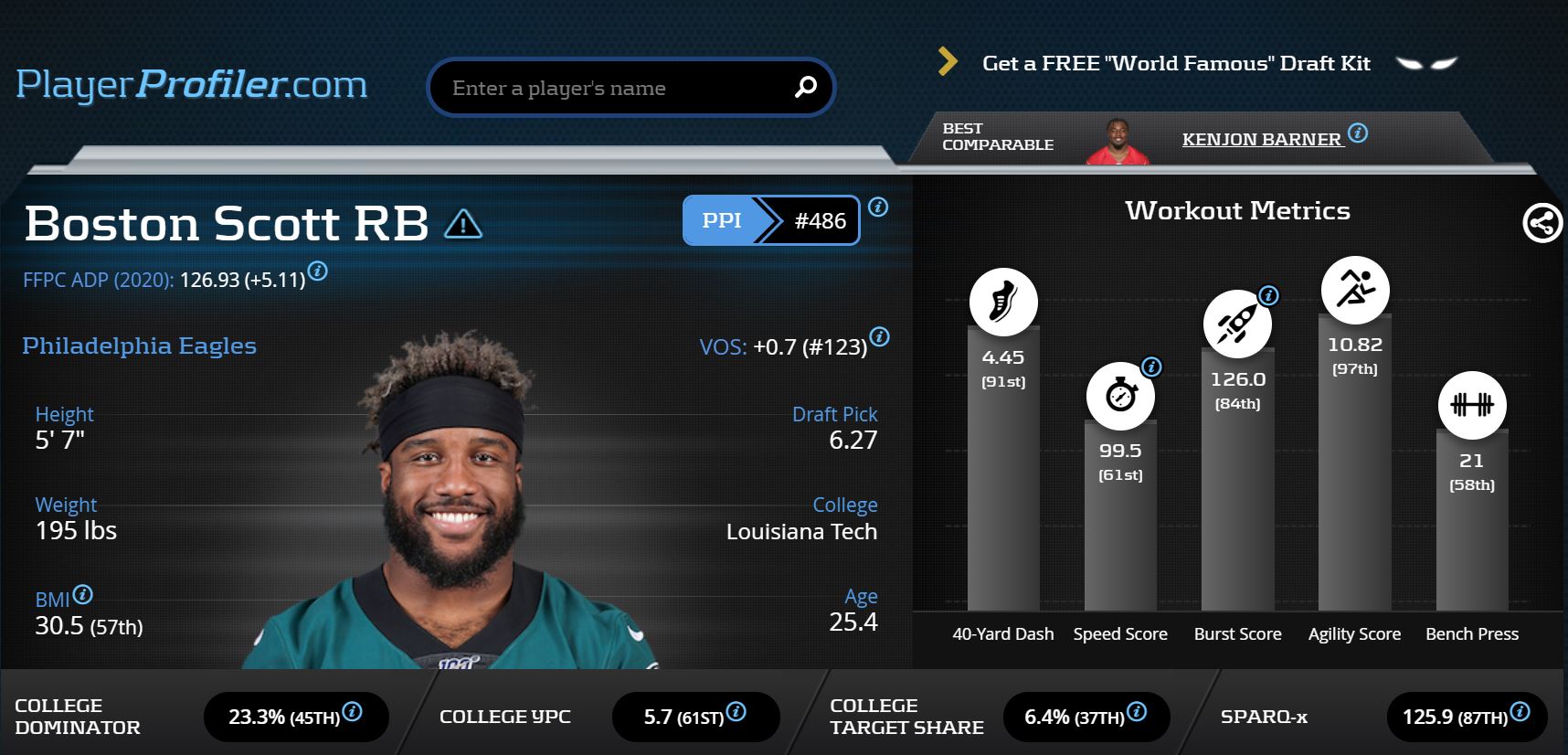 Standing at 5-7, Scott packs a punch with his 4.45 (91st-percentile) 40-yard dash and 10.82 (97th-percentile) Agility Score. Scott finished 2019 on a tear, totaling 350 yards from scrimmage and four touchdowns over the final four games. Although undersized, he fits perfectly in the Eagles scheme as a satellite back and spot starter with RB2 upside.