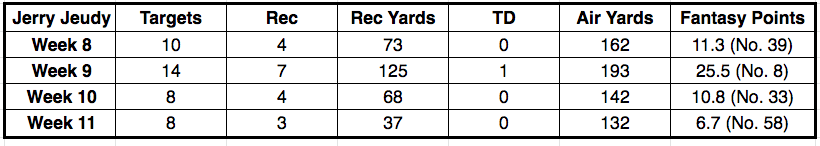Landry currently holds a 23.8-percent (No. 18) Target Share, with 46 (No. 30) receptions and 611 (No. 28) receiving yards. Efficiency-wise, Landry has a -7.9 (No. 62) Production Premium and averages 9.0 (No. 39) Yards per Target with 0.47 (No. 22) Fantasy Points per Route Run. Since Week 7, when Odell Beckham suffered a season-ending ACL injury, Landry’s volume has gone up and down with two 11-target games. In Week 12, he scored his only touchdown of the season in his best game so far, where he caught eight of 11 targets for 143 receiving yards. In summary, it’s risky to trust Landry, especially with the middling target volume and a quarterback that lacks efficiency.