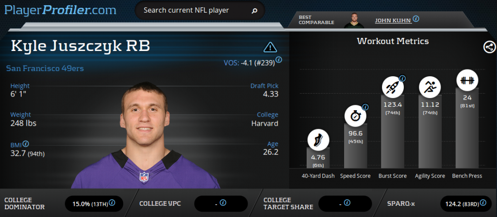 Carlos Hyde did not spontaneously erupt into one of the most dominant rushers in football. Hyde’s success is largely due to running behind one of the best fullbacks in the NFL. Through the first four weeks of the season, Kyle Juszczyk logged 84 snaps and has a 76.8 run block rating, according to ProFootballFocus.com. Juszczyk’s run block rating is exceptional and Hyde benefits from sharing the backfield with him.