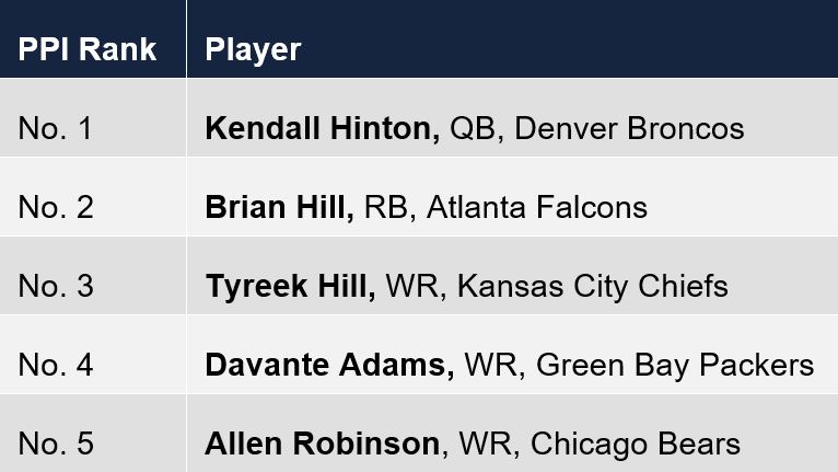 PlayerProfiler’s Player Popularity Index (PPI) tracks individual player profile page views over the past 30 days and ranks them accordingly. Each week, this article will highlight the five highest-ranked players and use our advanced stats and metrics to provide fantasy football insight on each. Following Sunday’s action and prior to Monday Night Football, the PPI pinpointed the following top-five trending players for Week 12: