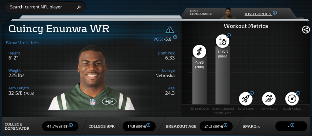 Drafted in the sixth round of the 2014 NFL Draft, it wasn’t until 2016 that Quincy Enunwa produced significant fantasy numbers. Something he accomplished despite questionable quarterback play and two veteran studs in front of him; Eric Decker and Brandon Marshall. Kenny Golladay is likely a different player then Enunwa, who played at a higher level of competition in Nebraska but was less productive in yards and touchdowns and never had a YPR over 14.8. But we don’t know what team he will be on, nor work for their coaching staff, so we can’t know his role. For now, however, the athletic and metric comparison provides a successful NFL archetype for Golladay.