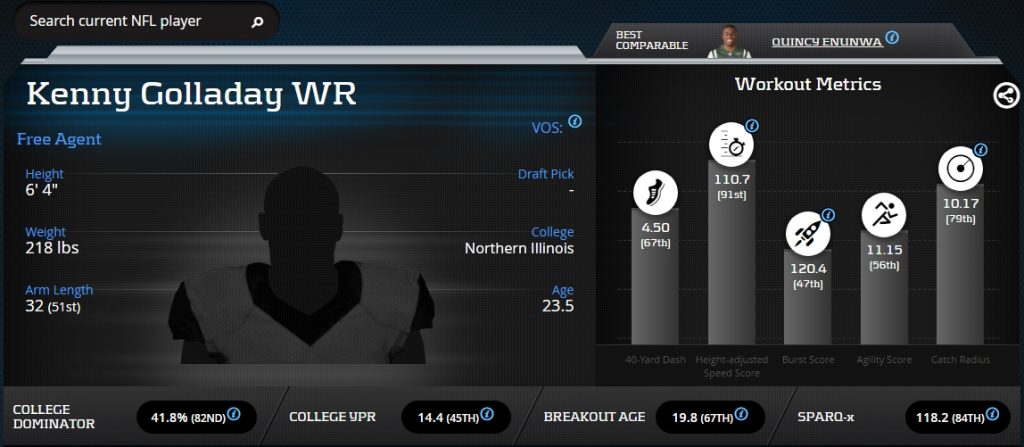 In the end, it results in a prospect with a 41.8-percent College Dominato Rating (82nd percentile) and a 19.8 Breakout Age (64th percentile). Both are predictive measurements we like to stalk when looking for later round value. Kenny Golladay’s dominance in the receiving game matters more to me than the success of the Northern Illinois Huskies game plan.
