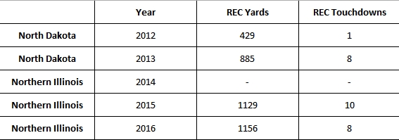 Wave a caution flag over Kenny Golladay‘s senior season. Even though he was still dominant and increased his yardage total, his touchdowns dropped. This was despite a slight increase in volume from 73 to 87 receptions. He also saw a decrease in yards per reception from 15.5 to 13.3. On top of this NIU’s lead rusher dropped from to 1286 and 18 touchdowns in 2015 down to 885 and 8 touchdowns in 2016. This drop in efficiency in the face of extra opportunity is concerning. I lean towards forgiving the slump because of the consistency in his production and the fact he didn’t regress or plateau after stepping up from North Dakota.