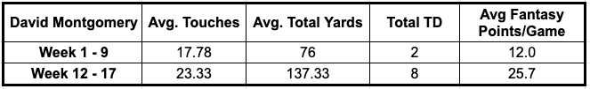 However, down the stretch, Montgomery faced weak run defenses, which led to massive RB1 production. He suffered a concussion in Week 9, and then missed a few weeks. After the concussion, he averaged over 23 touches and 137 total yards per game with eight total touchdowns and 25.7 Fantasy Points per Game. From Weeks 12-17, he finished inside the top-8 each week among fantasy running backs. That’s the perfect definition for dynasty sell-high candidates – finished the season as an RB1, but realistically more of a mid or back-end RB2.