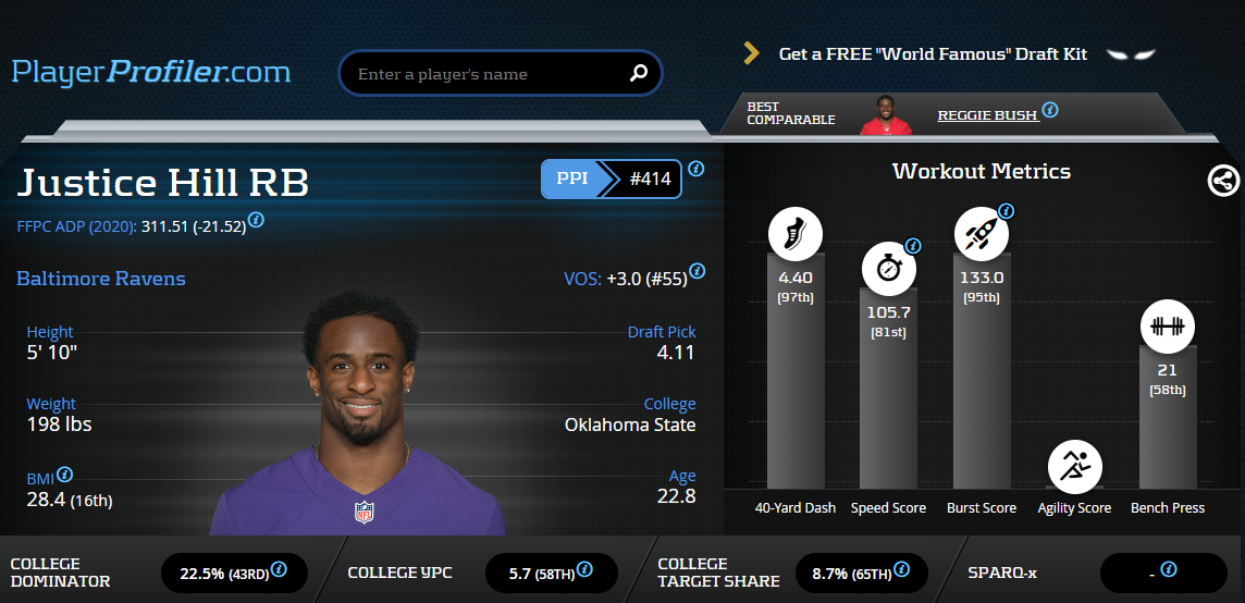 Hill’s player profile reveals a talented back with high marks in both Speed Score and Burst Score. His 4.40 (97th-percentile) 40-yard Dash time is equally impressive. The potential is there for him to be a three-down back. While no teams are likely to trade for him to be their starter, there are certain squads that can use a direct backup to their own starter.