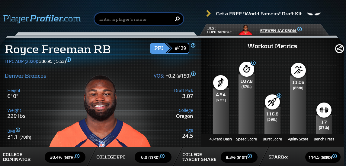 The former Oregon Duck was a workhorse producer during his college tenure. Through four seasons, Freeman maintained a 6.0 (73rd-percentile) yards per carry mark and a 30.4-percent (68th-percentile) College Dominator Rating. He accrued 79 receptions during that time, yielding an 8.3-percent (60th-percentile) Target Share. Three-down back potential lies within Freeman.