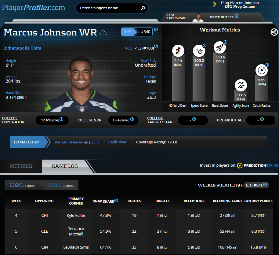 Will the real WR1 of the Colts please stand up! Marcus Johnson lead the Colts in targets, receptions, yards, Air Yards, and fantasy points in Week 6 against the Bengals. While he is still being out-snapped by veterans Zach Pascal and T.Y. Hilton, the fourth-year former undrafted free agent is clearly the only wide receiver on the roster that can effectively stretch the field.