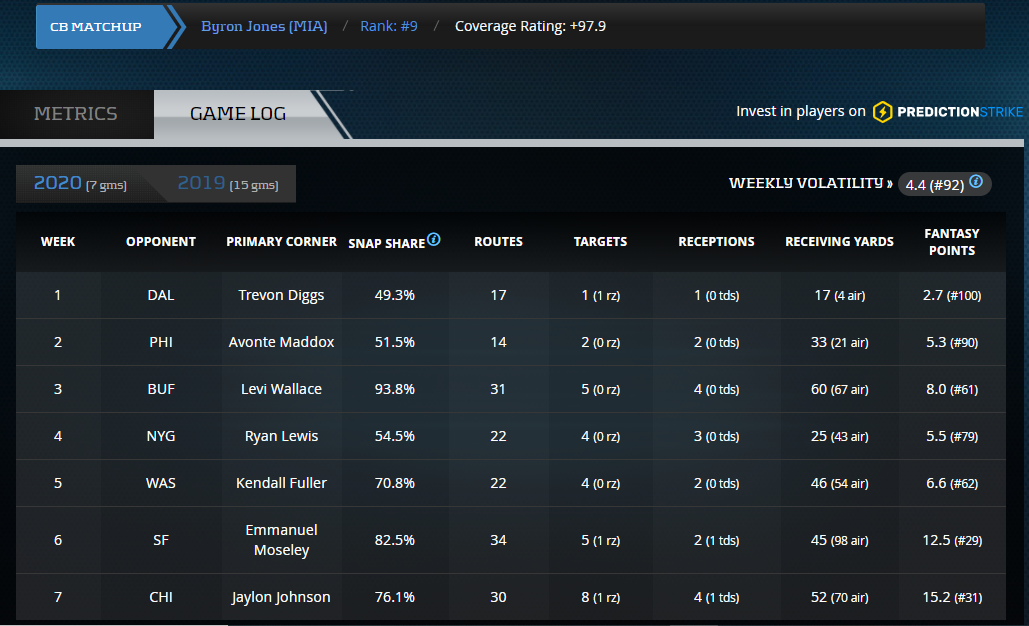 That putrid smell emanating from New England is the Patriots offense. Since Cam Newton‘s return from COVID, the Pats have thrown for an average of 159 passing yards per game and zero passing touchdowns. Regardless, Damiere Byrd is the last man standing in the Patriots passing attack. With both Julian Edelman and N’Keal Harry expected to miss Week 8, Byrd will look to supplant Edelman as the Patriots leader in Air Yards. Priced under $4,000 and with 4.32 (99th-percentile) 40-Yard Dash speed, Byrd is one big play away from from maximizing his value.