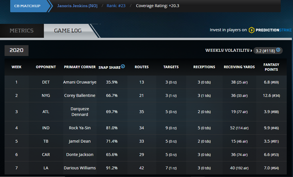 With an 17.8 Average Target Distance mark, Johnson is seeing six more yards per target than his aforementioned teammates. Priced at the stone cold minimum, look for him to exploit a Detroit secondary that is magnanimous to opposing wide receivers.