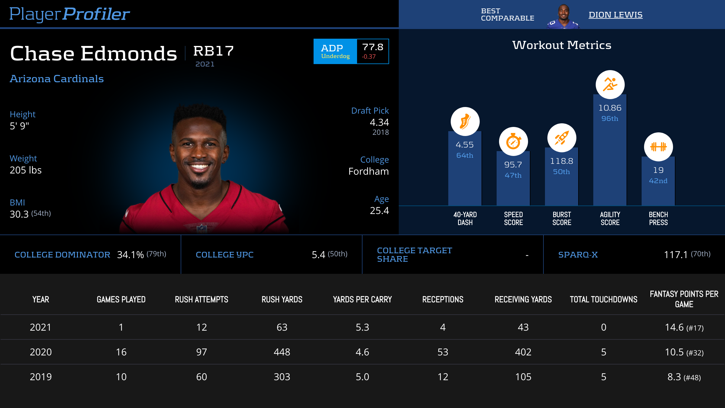 The Jaguars defense has allowed 5 total RB receptions throughout the first two weeks of the season. While that may not seem like all that much, they have also allowed several shallow receptions between the chains. Chase Edmonds is exactly the kind of player that feasts on these shallow targets. He has 9 receptions and averages more than 5 yards per carry this season. His 10.86 (96th-percentile) Agility Score shows that he has the shiftiness in the open field to avoid tackles against a Jacksonville defense that has allowed over 400 yards of offense in both their games this season.