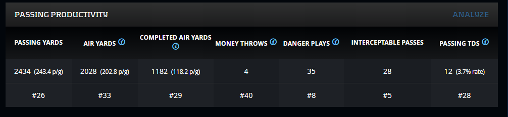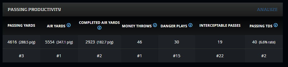 Trailing Brady, with 39 Money Throws each, were Patrick Mahomes and Baker Mayfield. Mahomes had 15 (No. 28) Interceptable Passes, while Mayfield had only 10 (No. 25) Interceptable Passes. Josh Allen was next on the list with 36 Money Throws, but he was more volatile than the three players ahead of him. Allen threw 24 (No. 8) Interceptable Passes, while also engaging in 44 (No. 2) Danger Plays. But as we can see from these players, quarterbacks with the ability to deliver in clutch moments tend to be on successful teams. Two of the top four quarterbacks in Money Throws, namely Brady and Mahomes, made the Super Bowl. Mahomes and the Chiefs eliminated both Mayfield’s Browns and Allen’s Bills.