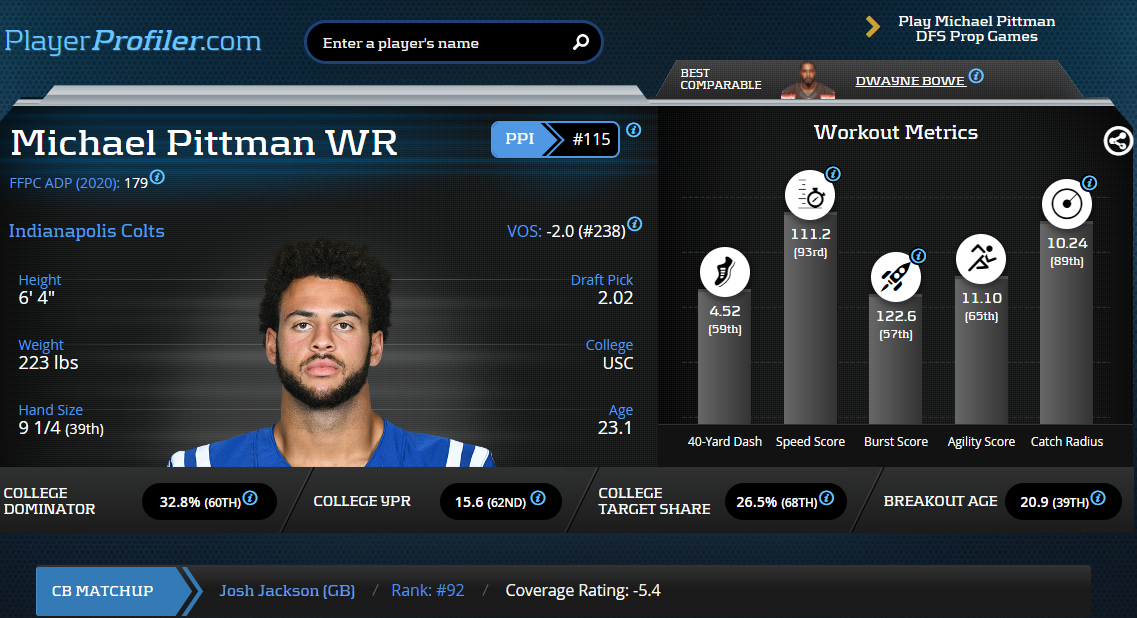 Michael Pittman broke out in Week 10 with 101 yards on seven receptions. His college profile indicates that he will keep breaking out all over the place. Pittman missed time early in the season while recovering from a calf surgery. In his absence, no other Colts receiver managed to top a 16.0-percent Dominator Rating. That means the Colts offense is loaded with receivers who are outside the top-75 in Dominator Rating and cannot be the driving force of an offense.