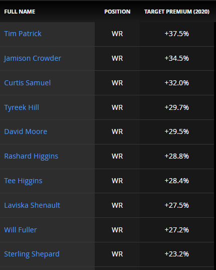When we look at the wide receiver leaders in Target Premium from 2020, there are a few who will be playing with a new quarterback in 2021. If we are to use the metric to identify likely breakout candidates, then the obvious one would seem to be Laviska Shenault.