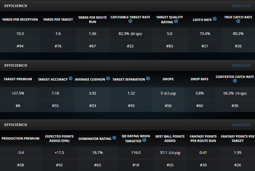 In his rookie season, Shenault had a 7.18 (No. 55) Target Accuracy mark, along with a 5.0 (No. 83) Target Quality Rating. Yet he was still able to finish with a +27.5-percent (No. 8) Target Premium. With Trevor Lawrence likely to be the Jaguars quarterback in 2021, an upgrade in accuracy allied to his efficiency as a receiver can only mean good things in year two.