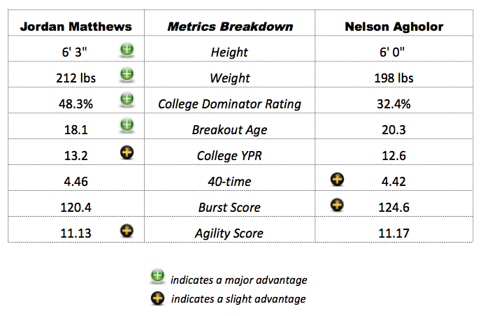 Matthews’ most impressive metrics were a 48.3-percent College Dominator Rating and an 18.1 Breakout Age — both are exceptional. On the other hand, Agholor shows a slightly better straight line speed and burst.