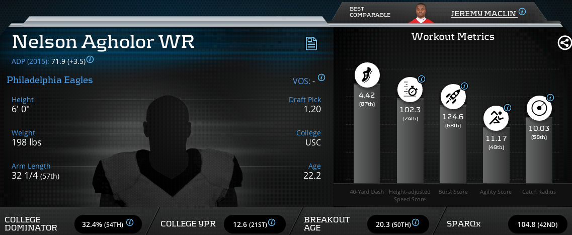 Given that Agholor and Maclin are close comparable on PlayerProfiler.com, a large swath of the fantasy football community jumped to the conclusion that Agholor would seamlessly fill the flanker role left vacant by Jeremy Maclin, and his fantasy scoring would be reasonably close to Jordan Matthews, who would likely remain slot role.