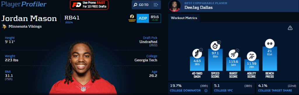Unfortunately, a shoulder injury, the brief return of Christian McCaffrey, and an ankle injury significantly reduced his role and ultimately ended his season early. It looked like Mason would once again be relegated to a pure handcuff role behind Christian McCaffrey in 2025. His fantasy outlook improved greatly after a trade sent him to Minnesota to complement Aaron Jones.