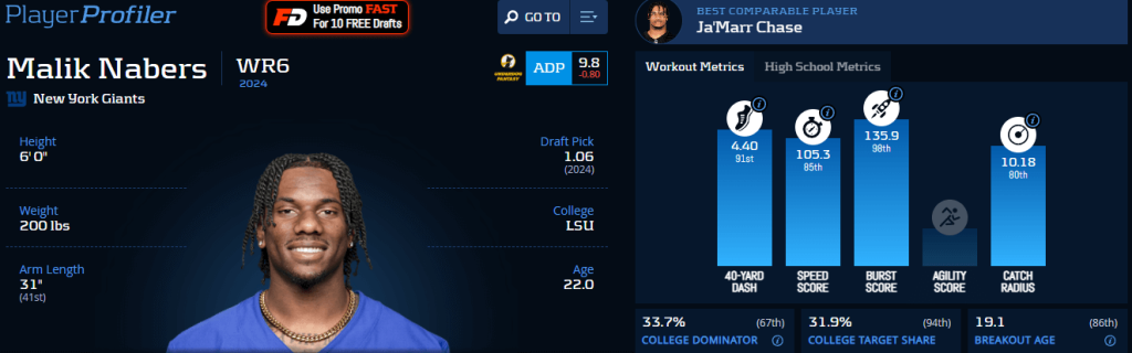 Malik Nabers’ Advanced Stats & Metrics Profile