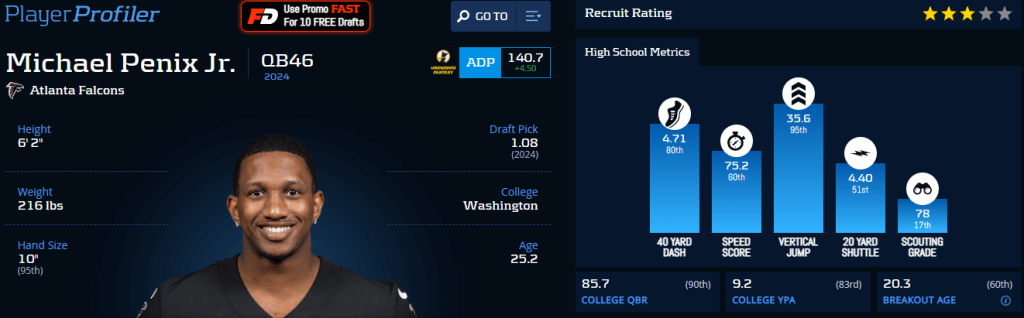 Strictly as a passer, Penix was the QB20 in his three-game stint as a starter. If he takes a reasonable step in 2025, he can be a high-end QB2 with QB1 upside.