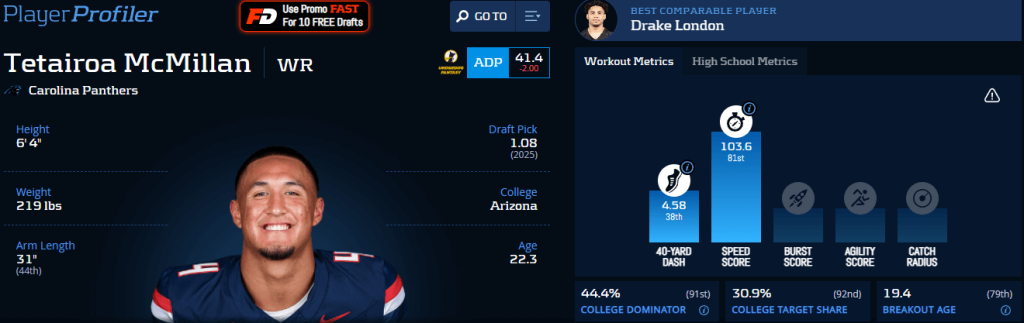 Tetairoa McMillan was one of the most scrutinized prospects in the draft cycle despite averaging 87.0 receptions, 1,360.5 receiving yards, and 9.0 touchdowns during his final two seasons at Arizona. According to PlayerProfiler’s advanced metrics, McMillan posted a 91st percentile Dominator Rating (44.4 percent) and a 92nd percentile college target share (30.9 percent).