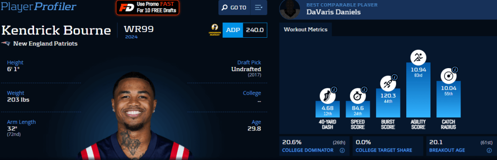 Kendrick Bourne appeared in just 12 games in 2024 while he recovered from a torn ACL suffered in 2023. The Patriots were desperate for receiving talent, but he struggled to provide any meaningful production (38 targets, 28 receptions, 305 receiving yards, and a touchdown) in an offense helmed by Drake Maye.
