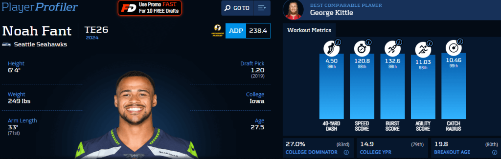 Noah Fant was an important part of the Russell Wilson trade in 2022, but he has never had the same production in Seattle as he did during his tenure with the Broncos. Over the last three seasons, Fant has caught 130 of 170 targets for 1,400 yards and five touchdowns. Last season was the first time he reached 500 receiving yards since 2021, finishing with 500 on the dot.