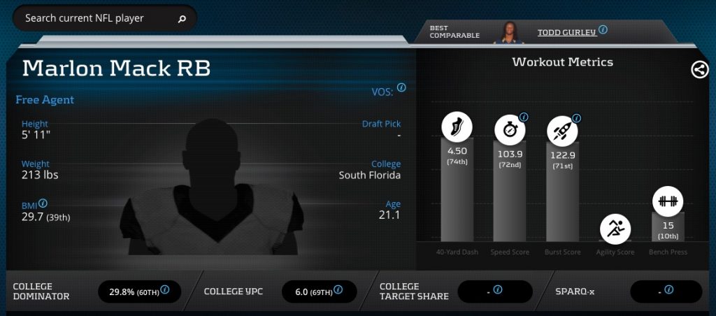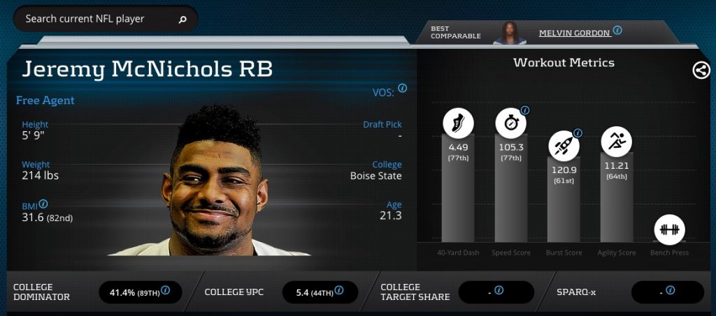 Jeremy McNichols could not have landed in a better spot, as the Buccaneers are loading up on offense in every way possible. McNichols did it all at Boise State, posting a 41.4-percent (89th-percentile) College Dominator, and has the size and athleticism to make an impact in the NFL as both a runner and a receiver.