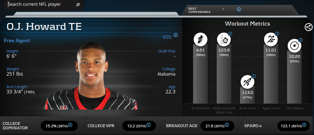 O.J. Howard ran a 4.51 (97th-percentile) 40-Yard Dash with a 123.9 (98th-percentile) Speed Score, 11.01 (97th-percentile) Agility Score, 123.1 (86th-percentile) SPARQ-x Score, and has a 10.2 (86th-percentile) Catch Radius, checking all the boxes as far as measurables go. Most comparable to Greg Olsen, Howard is the most NFL-ready tight end of this years’ class. With defenses forced to respect DeSean Jackson’s deep speed in addition to the always dangerous Mike Evans, the entire Tampa Bay offense gets a bump in value due to Howard’s presence alone.