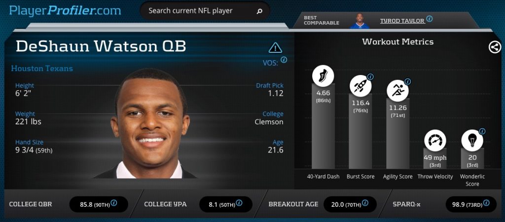 Deshaun Watson is an upgrade from Brock Osweiler. Unfortunately, that’s not saying much. Watson was a winner and a great leader at Clemson, and while that’s great and all, there are concerns when it comes to the measurables, specifically his arm strength. Watson’s has a Throw Velocity of 49 MPH, which means he has the weakest arm of any quarterback in the LEAGUE, let alone this draft class. If Watson can’t fit the ball into tight windows or between defenders, it won’t matter how many games he won in college.