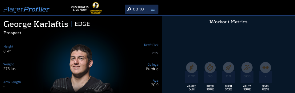 Early in the 2022 NFL Draft process, George Karlaftis was a consensus top-10 pick. Often times, he was the next EDGE defender taken in the Top 5 after Kayvon Thibodeaux. Karlaftis finished his freshman seasons at Purdue with 7.5 sacks and 17 tackles for loss. He was unable to follow up the performance in 2020 due to COVID-19, and an injury that caused him to miss all but two games.