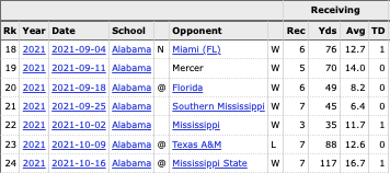 The least talked about wide receiver in Alabama’s receiver room over the last three seasons. Everyone thinks about Devonta Smith, Jameson Williams, Jaylen Waddle, and Henry Ruggs. But Ruggs and Waddle never eclipsed 900 receiving yards. Metchie finished with 916 as a sophomore and 1,142 as a junior in 2021 before an ACL injury in the conference championship. The connection you are looking at is from 2020. Metchie played with Mac Jones en route to a National Championship win over Ohio State.
