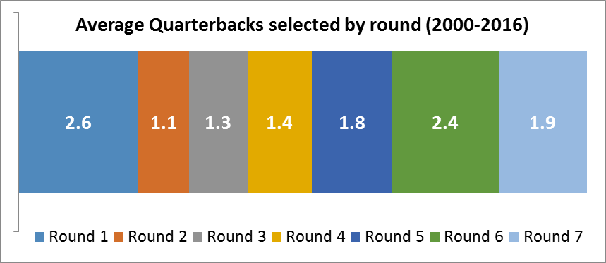 Before we dive into results, we should take a brief look at how the NFL draft tends to shake out for the quarterback position. As expected, it resembles a dumbbell. Take a look at the chart below to see the average outcome for quarterbacks in the NFL draft by round.