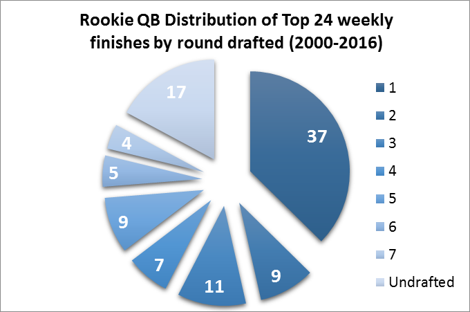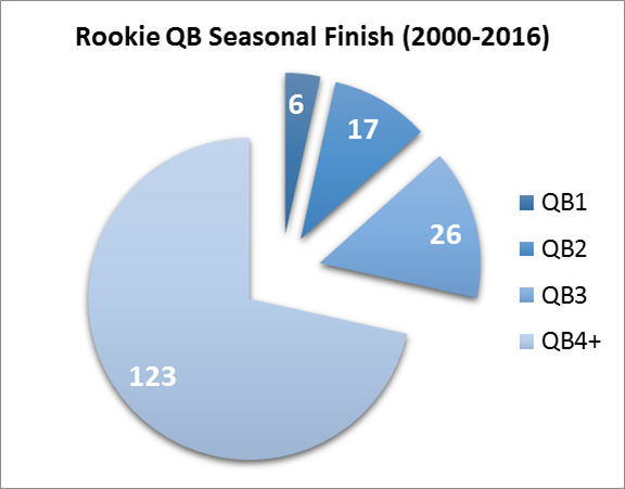 Overall, there were 172 rookie quarterbacks who scored fantasy points between 2000 and 2016. Of those, 23 (13.3-percent) finished at a fantasy QB2 level or higher (5.2-percent finished at the fantasy QB1 level). Only six of the 23 were drafted outside the first round and only two (Prescott and Chris Weinke) were outside the top 100 draft picks.