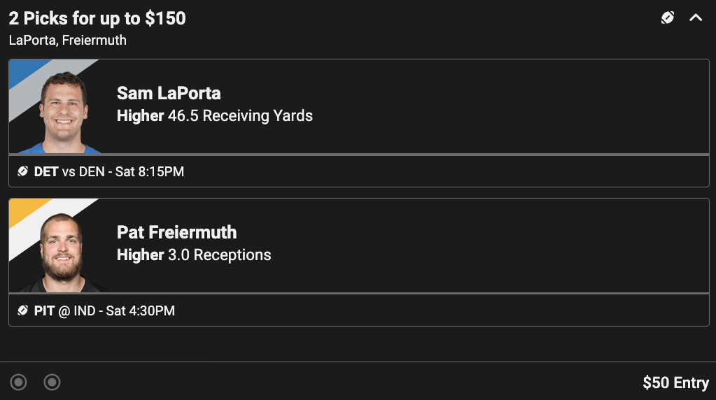 Both picks in my entry are in the Saturday slate. This is the ultimate buy-low on a Pittsburgh offense that nobody has faith in right now. Despite playing with Mitchell Trubisky for about a game and a half since last week, the tight end Pat Freiermuth has 12 targets over his last two games and at least three receptions in both games. On the season, he has at least three receptions in five of his eight games. Now, he gets a dream matchup against a Colts defense that ranks No. 1 in the NFL in zone coverage rate.
