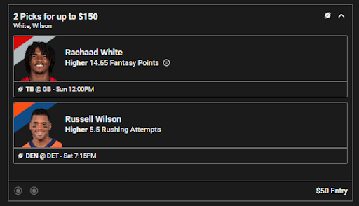 White now has 6 TDs in his last six games while amassing 626 rushing + receiving yards. The fantasy points option allows us to capture his TD upside along with his usage. His touchdown prop is currently -118 at sportsbooks which gives us even more value at Underdog. At 61-percent rushing attempt usage, and Baker’s checkdown tendencies, we love the over in this game.