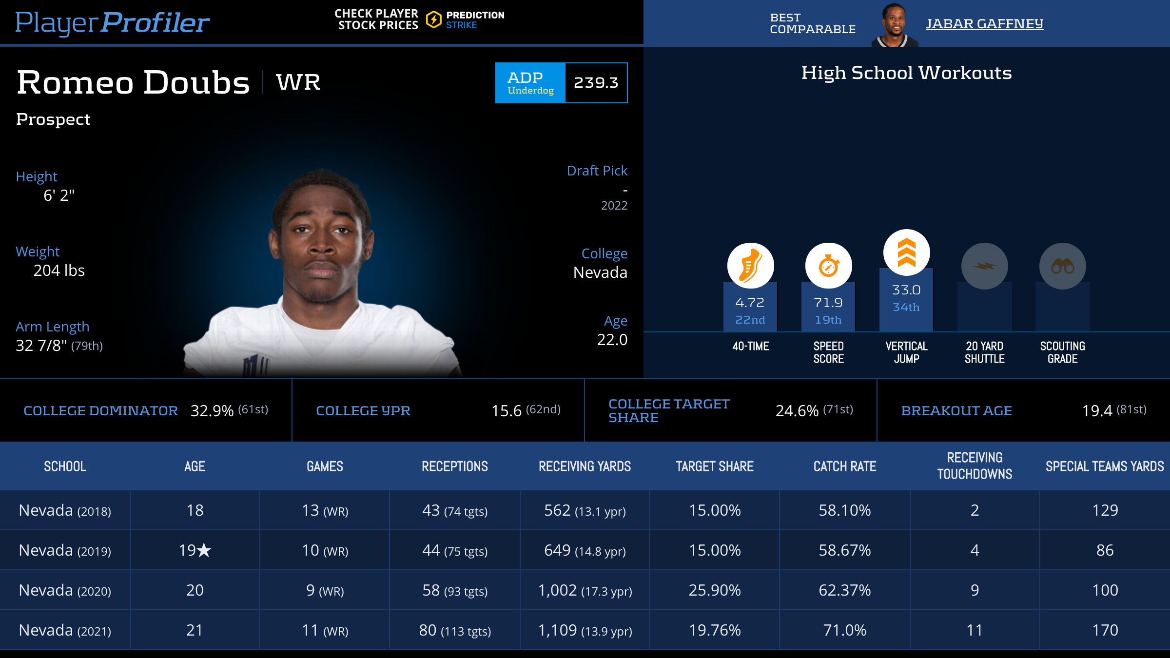 Rationale: We didn’t get testing numbers for Metchie but banking on the production numbers in college alongside Williams