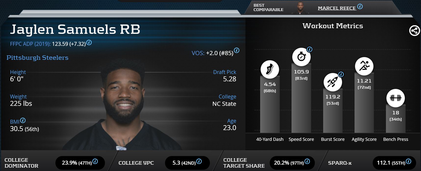 Both Conner and recently acquired rookie Benny Snell Jr. are below-average athletes, compared to Samuels, who is miles ahead. He’s faster, more agile and has more burst than the other two. Samuels has an 83rd-percentile Speed Score compared to Conner’s 32nd-percentile and Snell’s 30th-percentile. He has a 52nd-percentile Burst Score compared to Conner’s 6th-percentile and Snell’s 12th-percentile. And Samuels has a 72nd-percentile Agility Score compared to Conner’s 18th-percentile and Snell’s 49th-percentile. Conner was in a formidable position last year being the next man up in Pittsburgh after Bell’s departure. But based on athleticism and versatility, Samuels is the guy everyone should want to covet.