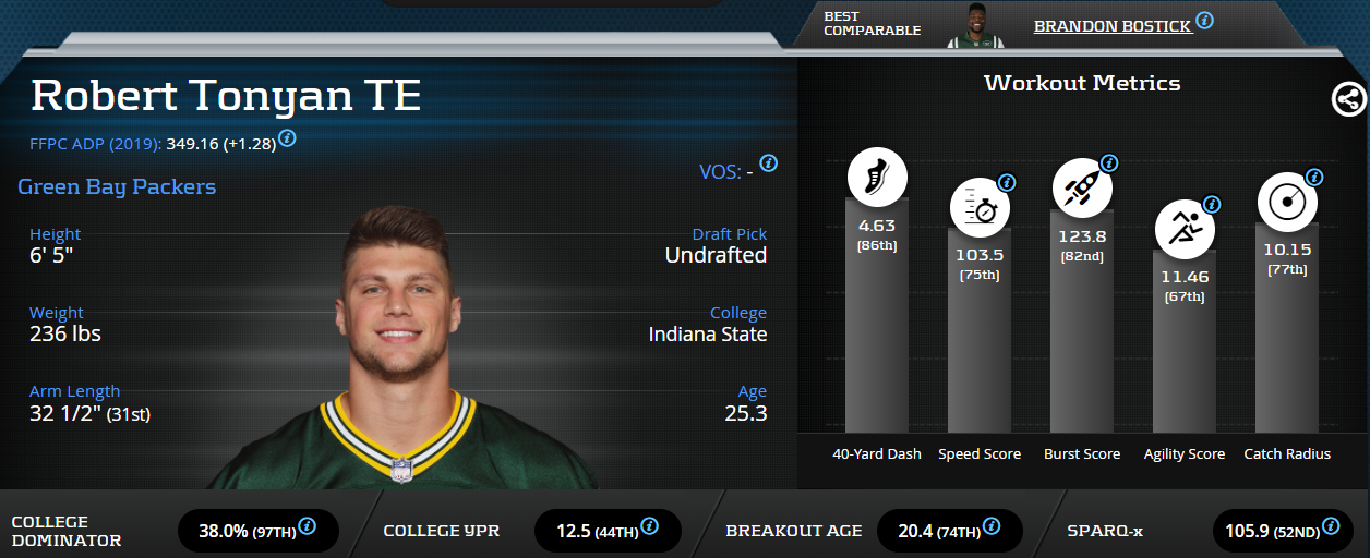 Robert Tonyan is a name that even seasoned dynasty vets might be unaware of. Currently nestled behind basically-washed Jimmy Graham on the Packers depth chart, Tonyan looks to make a palpable impact in 2019. His play in the preseason opener brought attention to his work ethic and athleticism. Anecdotal evidence is rarely founded, but if there is any player in the league who has an actual opinion-of-you to in-game-production ratio, it’s Aaron Rodgers. The wispy ghost of Jeff Janis agrees.