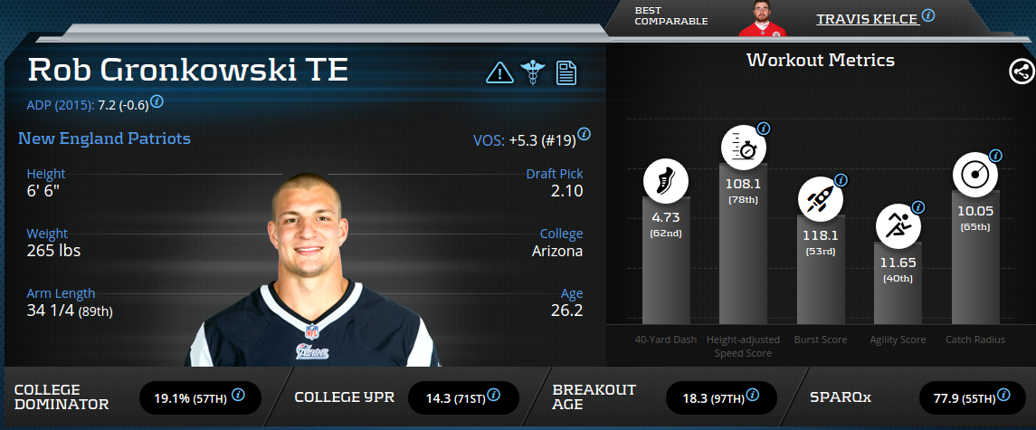 The prevalent argument from the pro-Gronk drafting community is as follows: “By selecting him in the first round, you immediately have an advantage over your league mates because of the giant gap in projected points between Rob Gronkowski and the next best TE. Not only does he offer the guarantee of a weekly high floor but also the highest ceiling of any other tight end.”