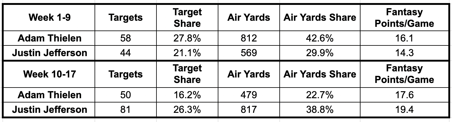 It’s a tale of two halves with Thielen starting hot then tailing off, yet touchdowns kept his fantasy production afloat in the second half. On the flip side, Jefferson earned more opportunities and produced. One quick caveat – the passing attempts increased for Kirk Cousins in the second half. Cousins averaged 26.1 pass attempts from Week 1-9, then averaged 38.5 pass attempts from Week 10-17. Even if we toss out Week 17 since it’s typically not fantasy-relevant, the opportunity and productivity metrics still hold strong.