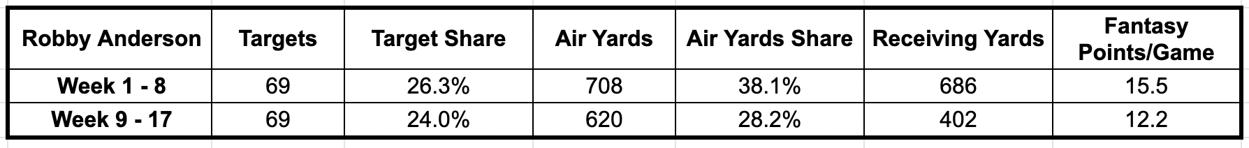 Speedster Robby Anderson reunited with his college coach Matt Rhule and exploded through the first half of the 2020 season. Anderson earned 138 (No. 8) Targets and a 26.1-percent (No. 6) Target Share with 1,328 (No. 15) Air Yards and a 33.1-percent (No. 18) Air Yards Share. Yes, the season-long opportunities look great, but the opportunities and production slipped a bit in the second half outside of the equal target total. That likely indicates that he struggled a bit down the stretch with efficiency, while D.J. Moore and Curtis Samuel trended up.