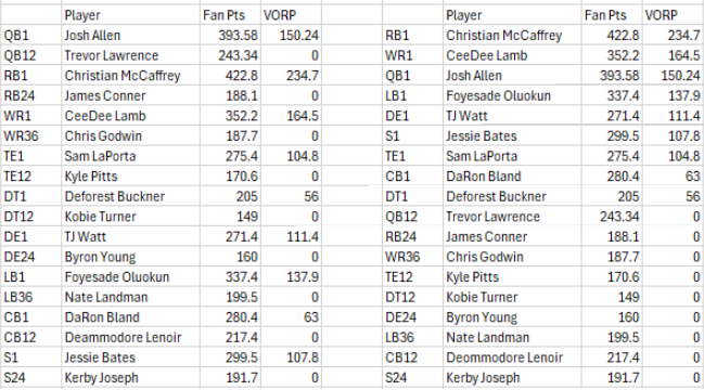 Above is a representation of a basic VORP chart. It contains the top scorer at each position in comparison with the “replacement player” at their position. The replacement player is determined by roster size. In a 1QB, 12-team league QB12 would be the replacement quarterback, while in a league that starts three receivers, WR36 would be replacement level. We then compare the difference between the top player at the position and the replacement player and that gives us our VORP.